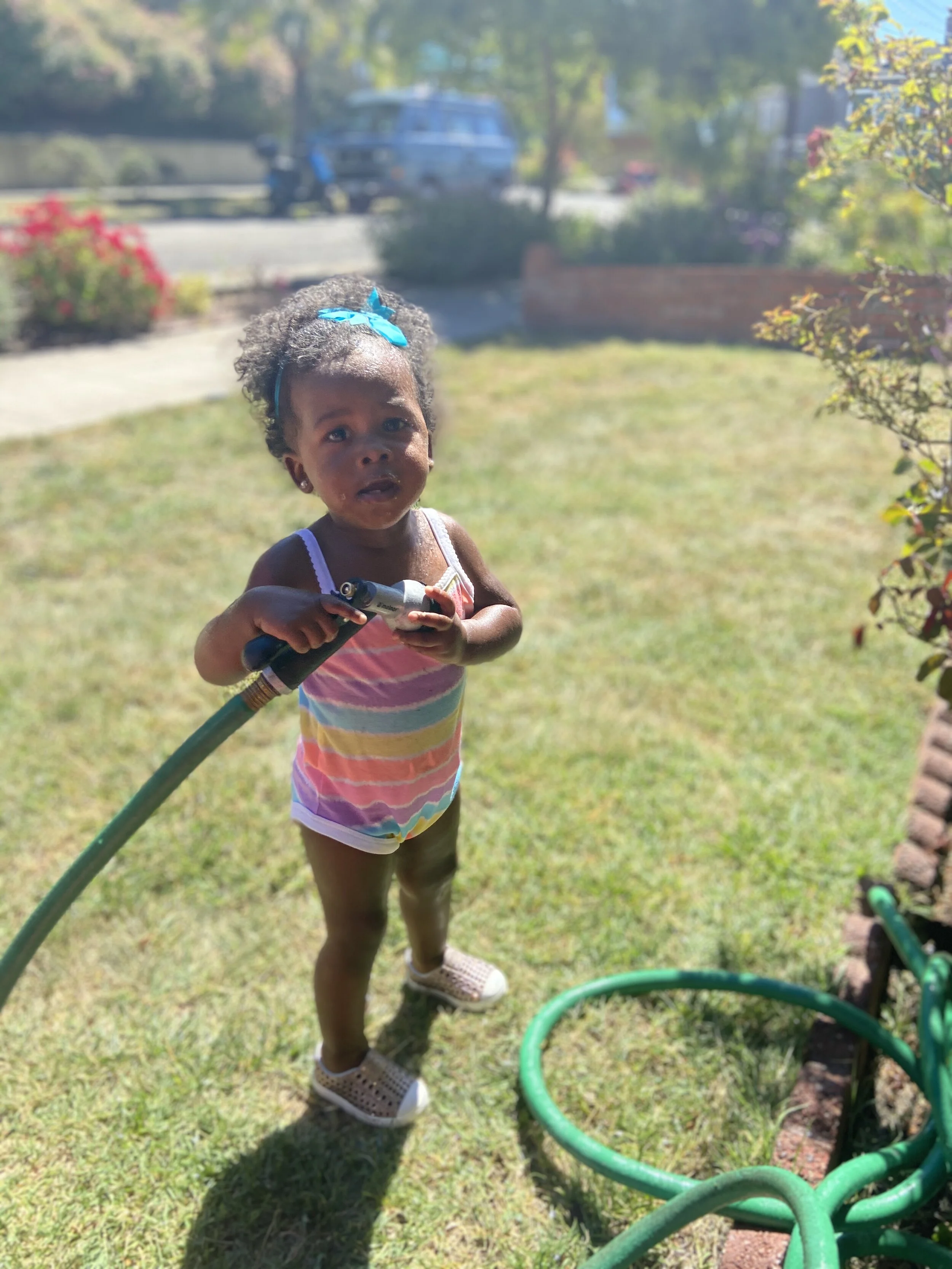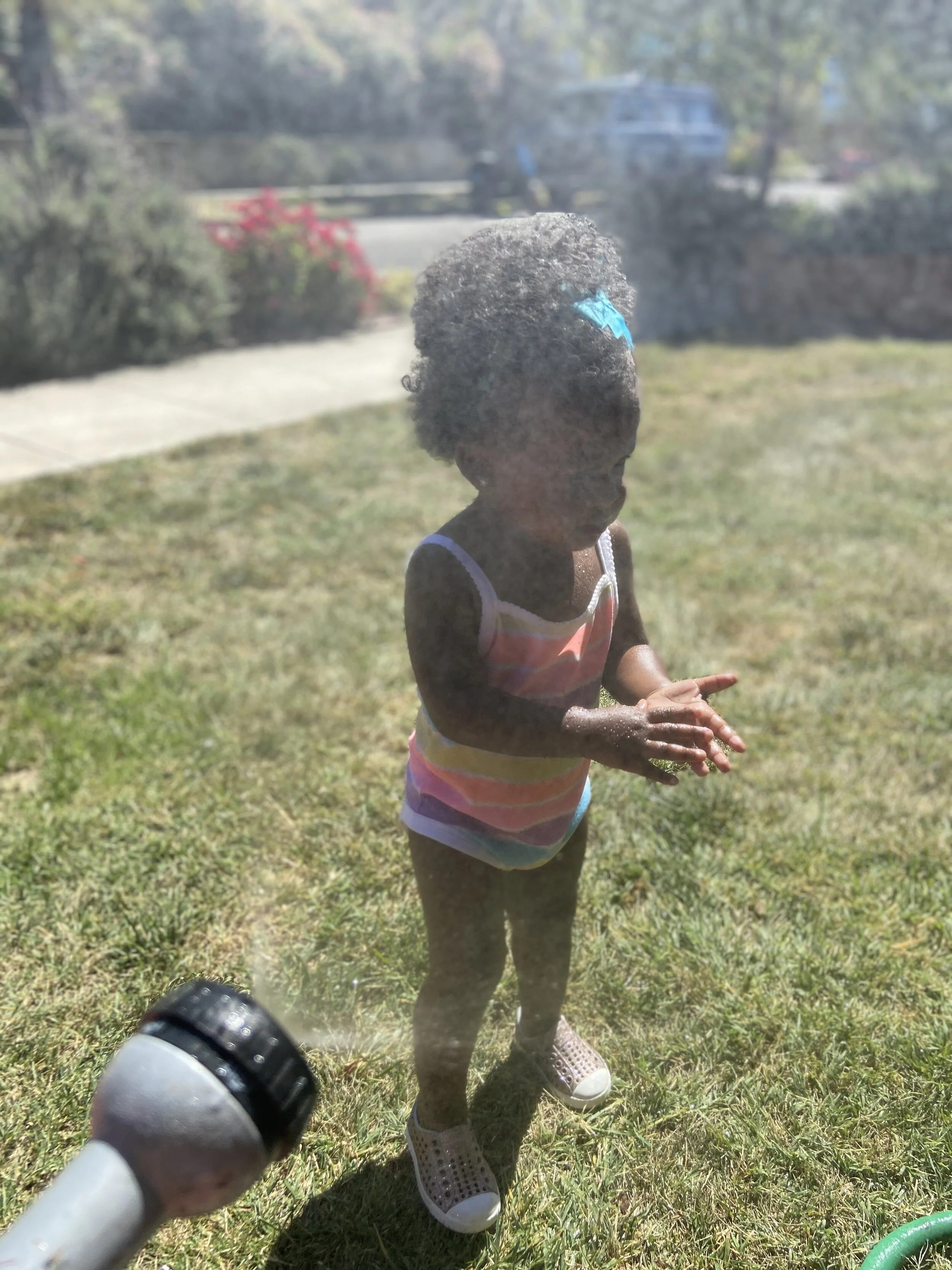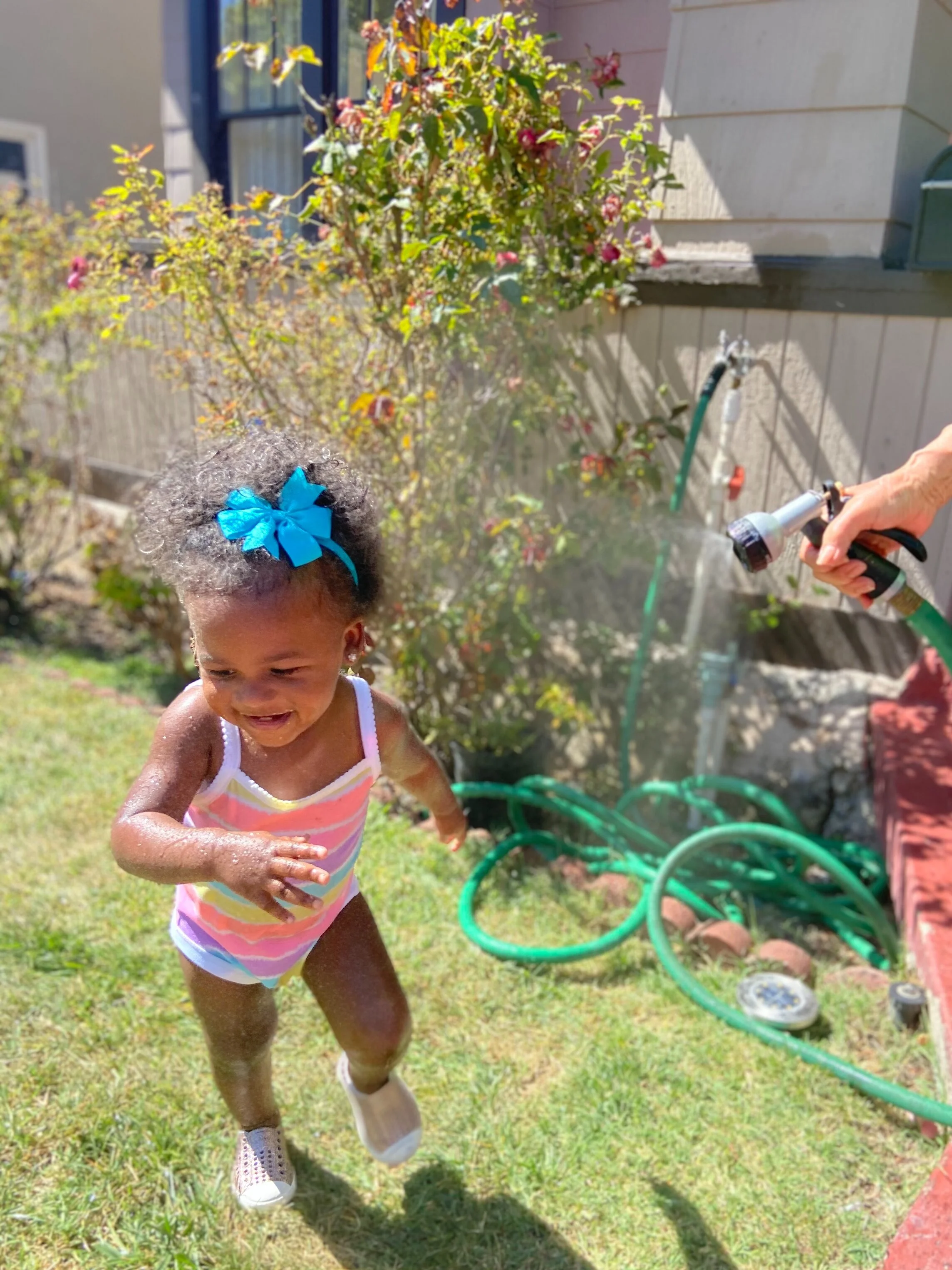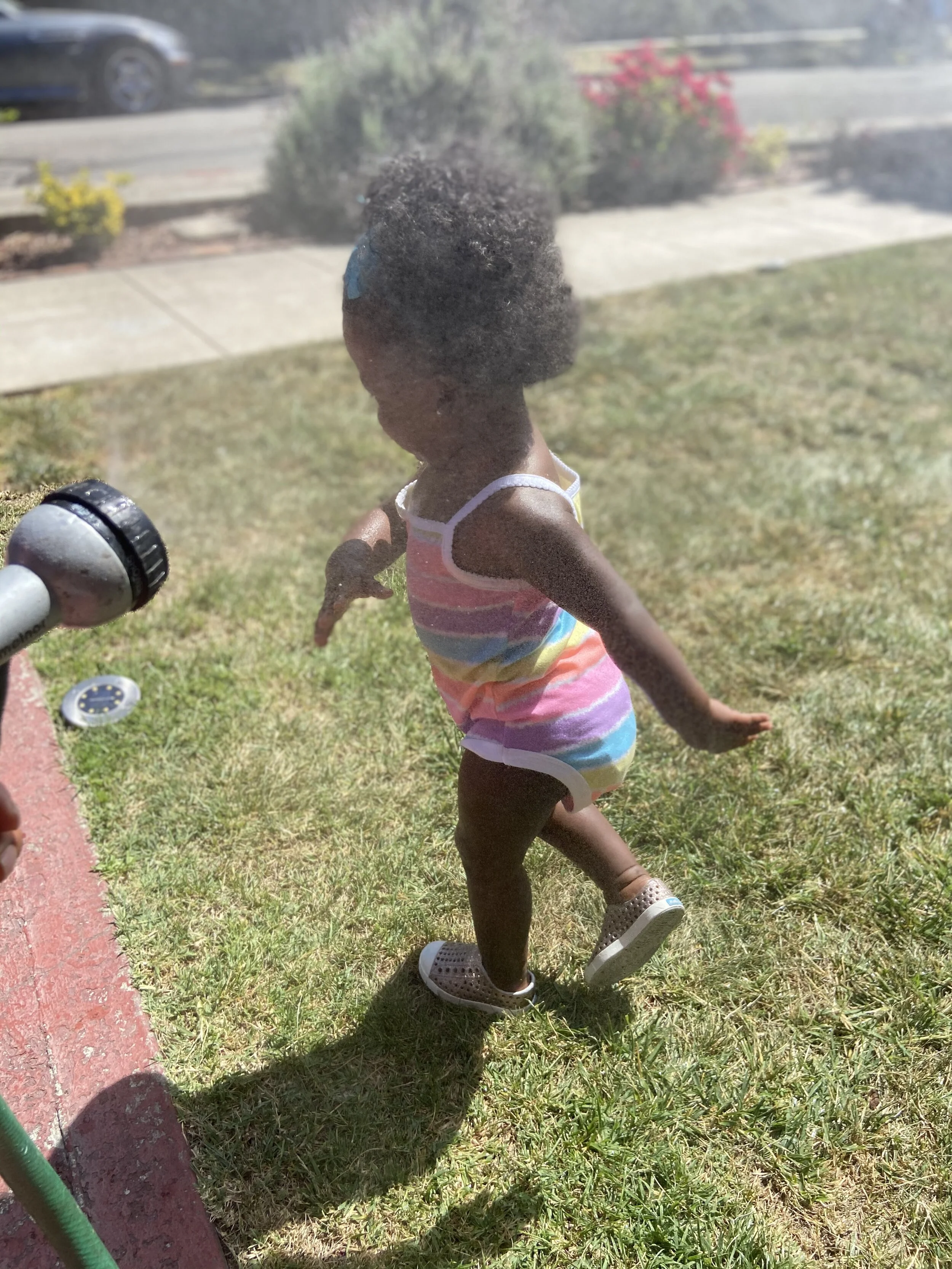 I am reminded just how important the simple pleasures are. Just as simple as baby girl playing in the front lawn as her daddy and grandmother spray the water hose at her.